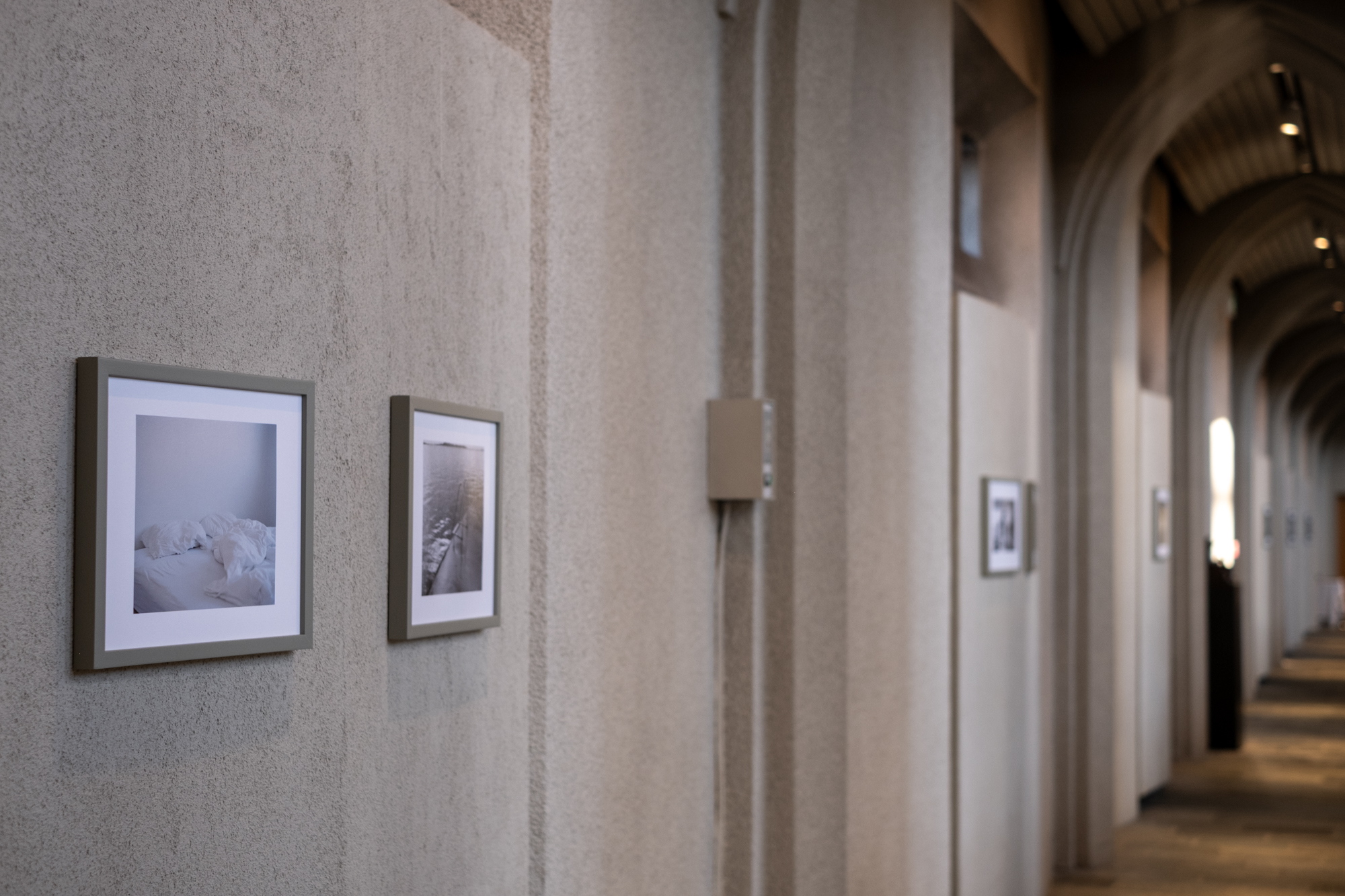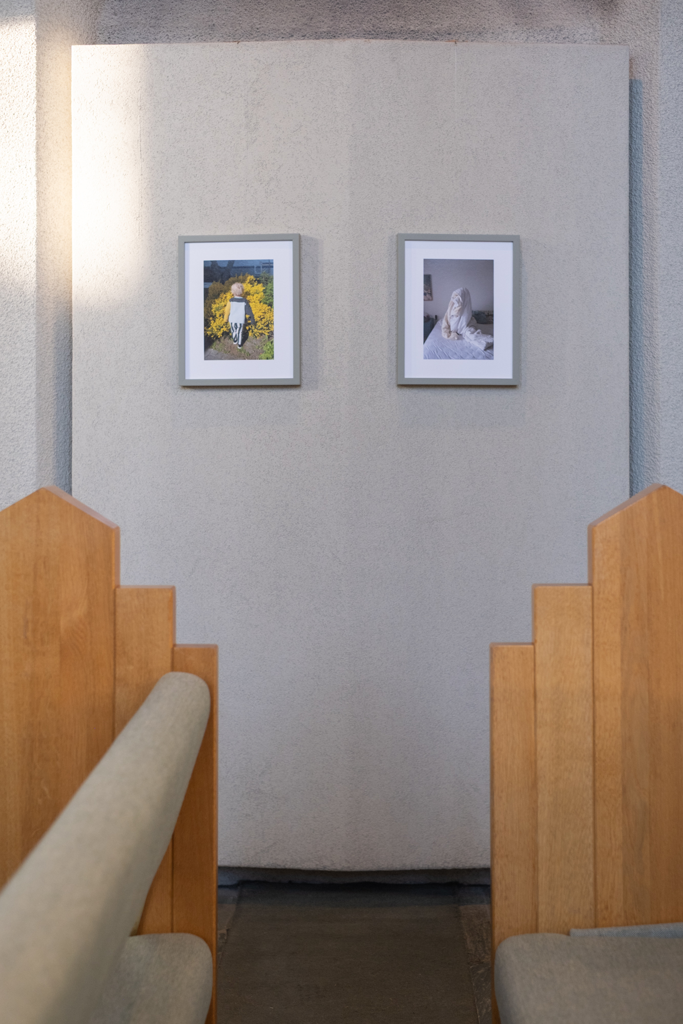 “On the side walls of the nave are pairs of framed photographs that lead to inward reflection in the haven of the loggia. Small photographs at eye level address personal, existensial conundrums of life on earth and emotional challenges. Hallgerður reflects herself in Hallgrímur, and by the same token observers reflect themselves.”