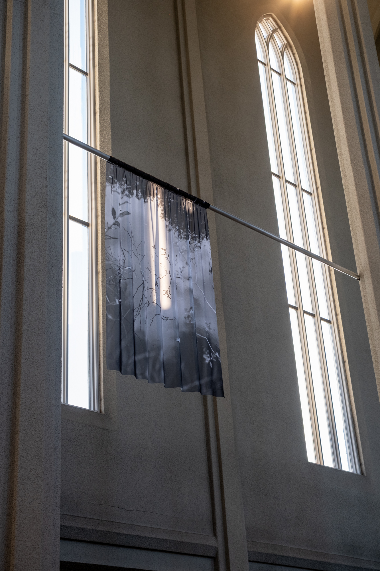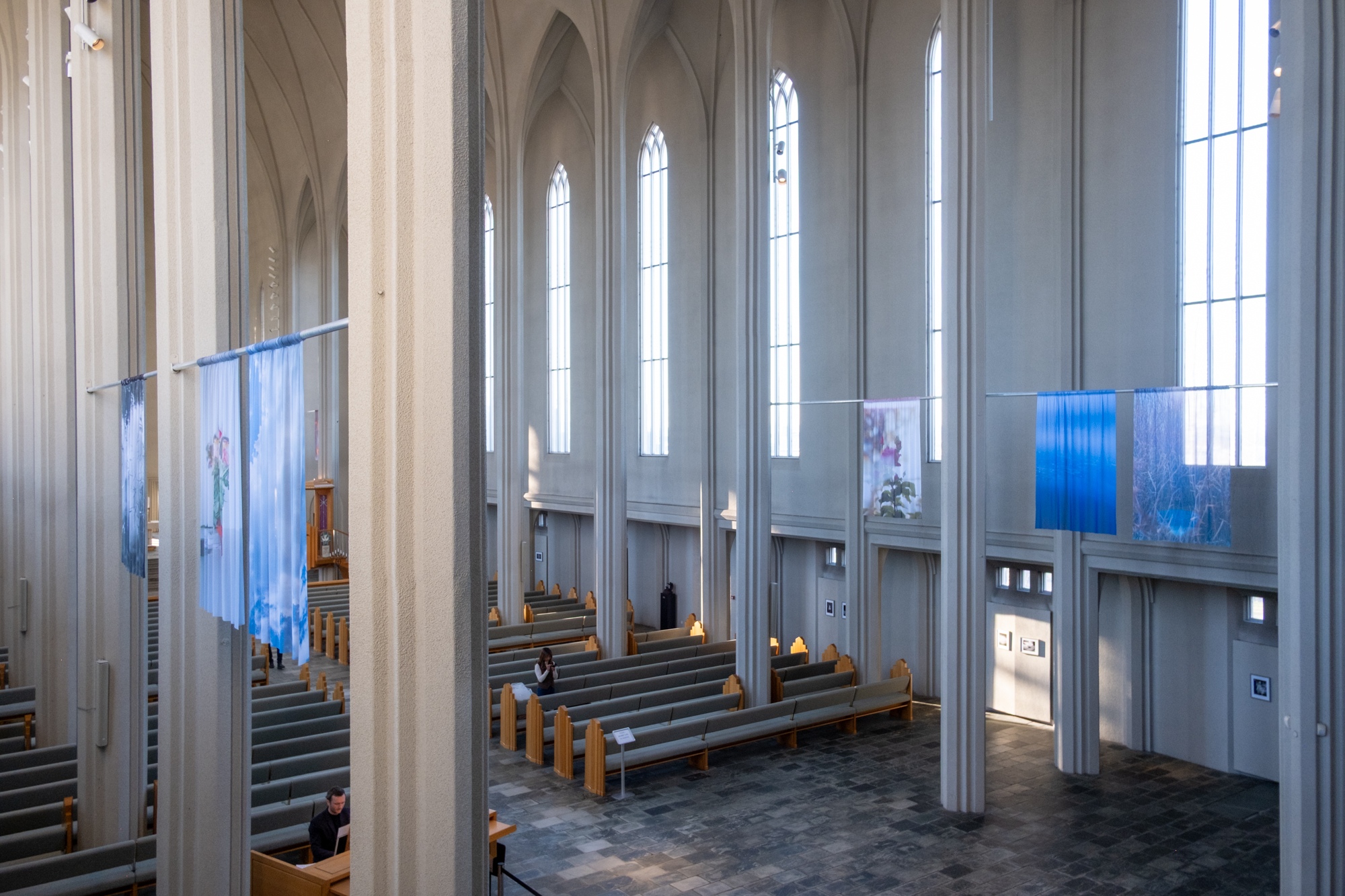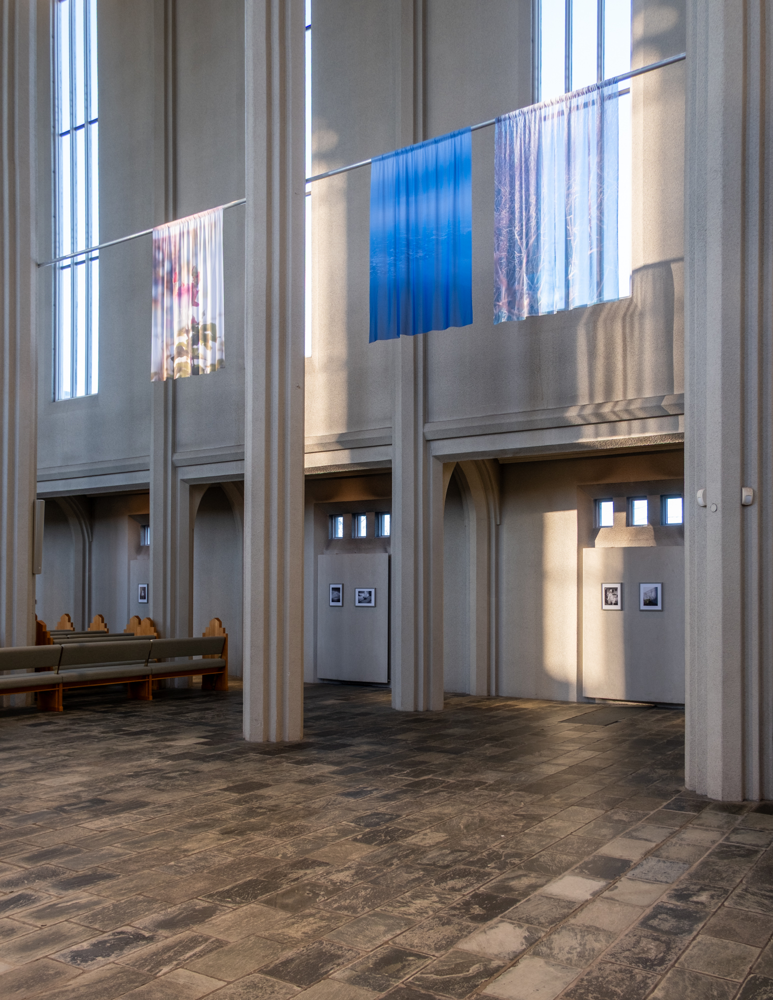 On entering the nave, Hallgerður’s photographs, printed on sheets of translucent fabric, lead the visitor’s eyes upwards against a background of magnificent architecture, gifing rise to thoughts of the spiritual dimension within the church, art and the univers — and not least of Hallgrímur’s intangible heritage.”
