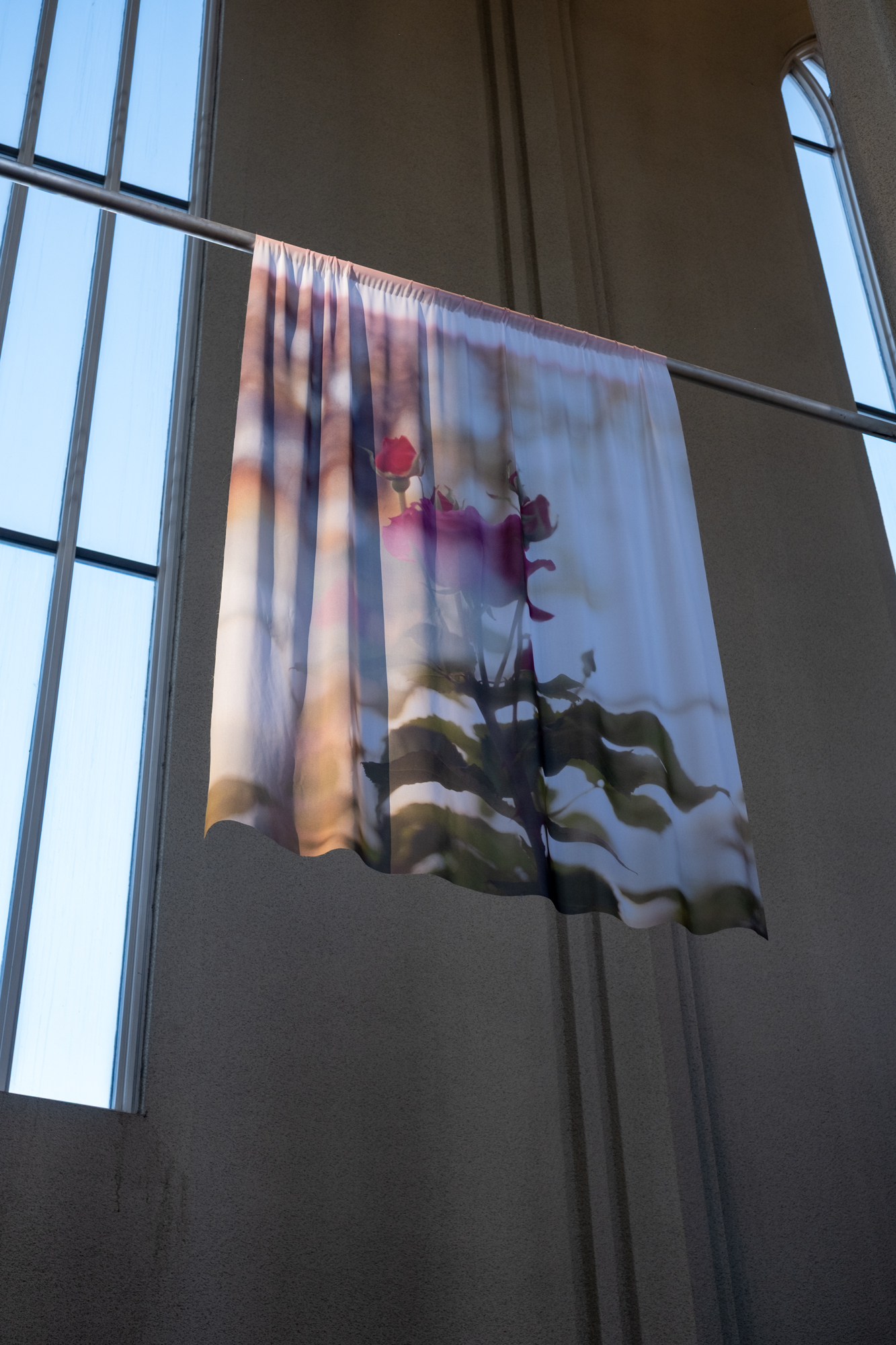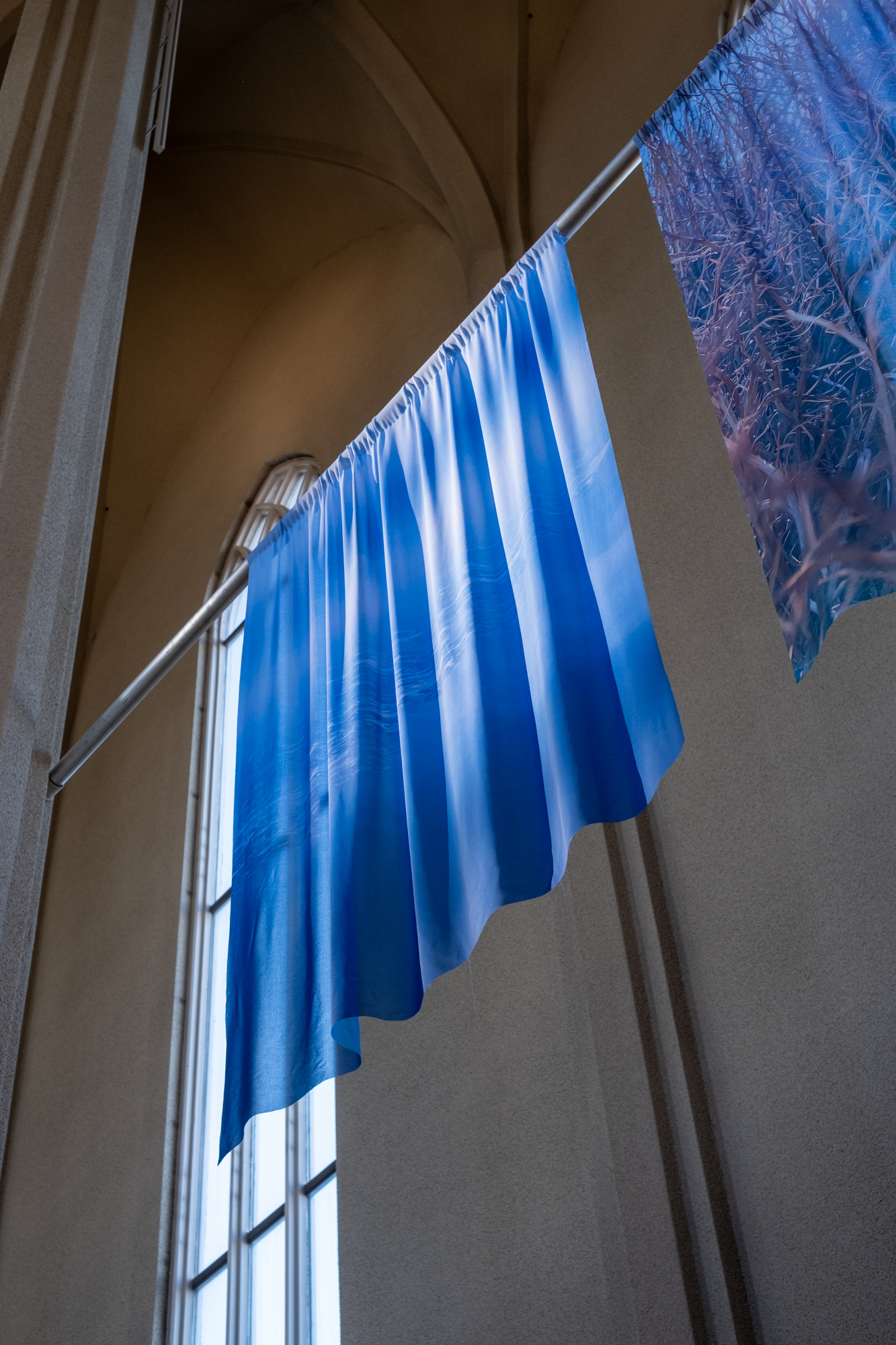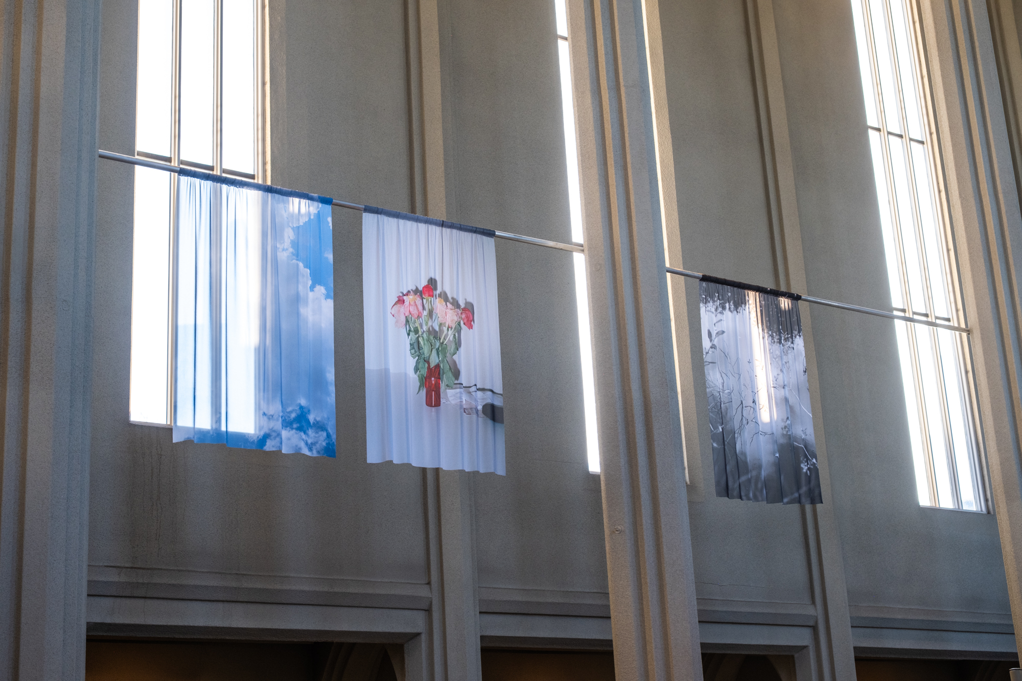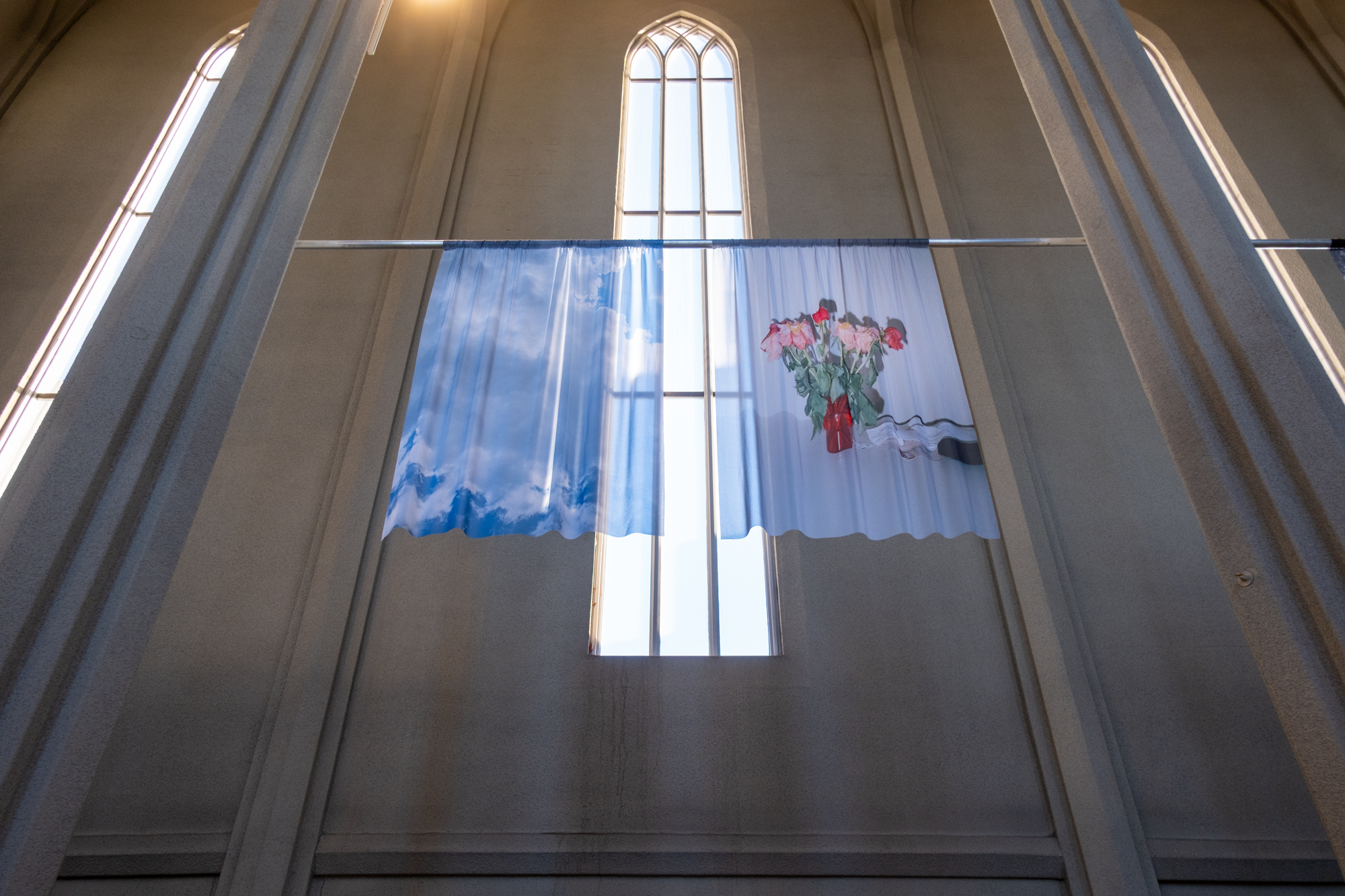 On entering the nave, Hallgerður’s photographs, printed on sheets of translucent fabric, lead the visitor’s eyes upwards against a background of magnificent architecture, gifing rise to thoughts of the spiritual dimension within the church, art and the univers — and not least of Hallgrímur’s intangible heritage.”